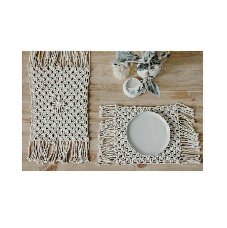 แผ่นรองจานมาคราเม่ผ้าทอจากอุตสาหกรรมแผ่นรองแก้วลายธรรมชาติทำด้วยมือพร้อมพู่