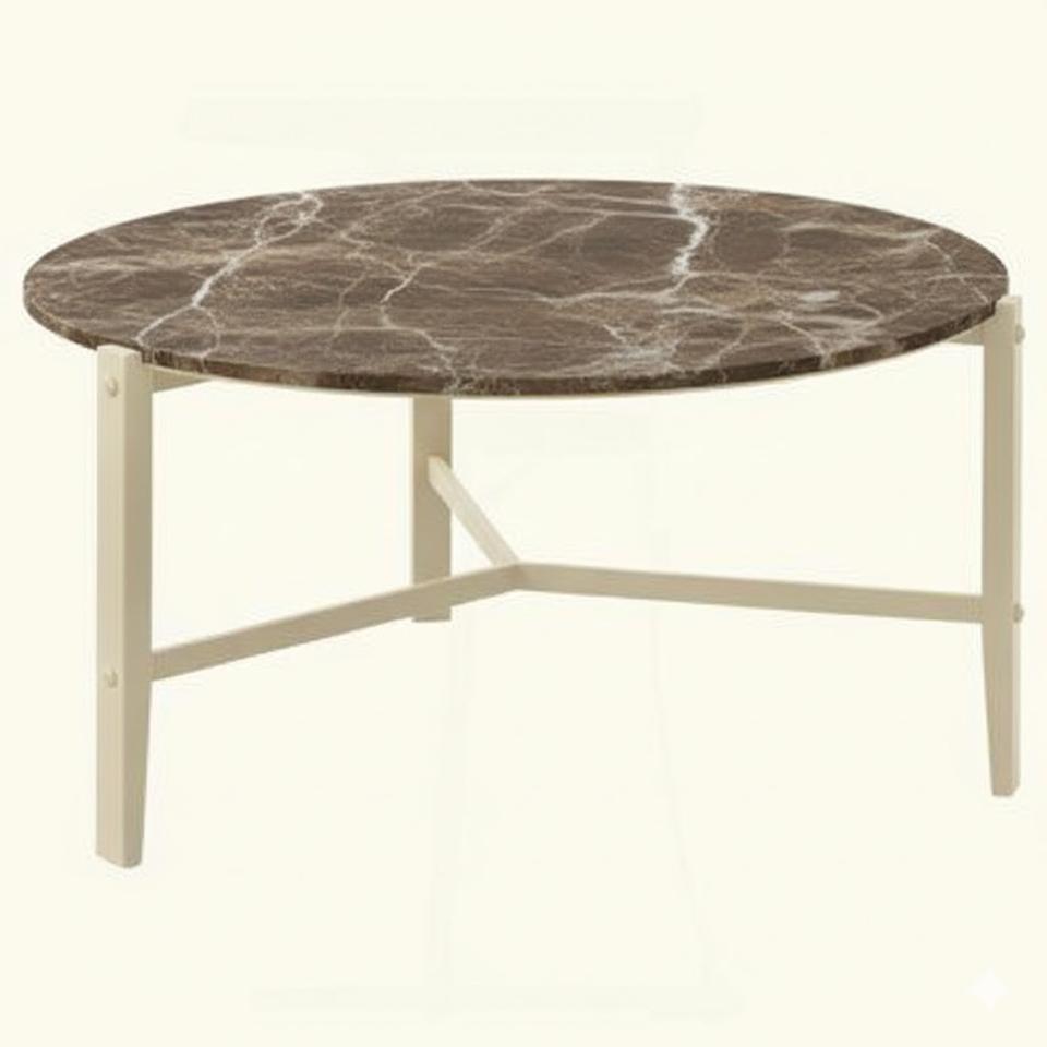 โต๊ะกาแฟทรงกลมสไตล์อินดัสเทรียล ท็อปหินอ่อนสีน้ำตาล โต๊ะน้ำชาสไตล์นอร์ดิกสำหรับห้องนั่งเล่น โต๊ะข้างโซฟาพร้อมฐานโครงเหล็กสีดำ