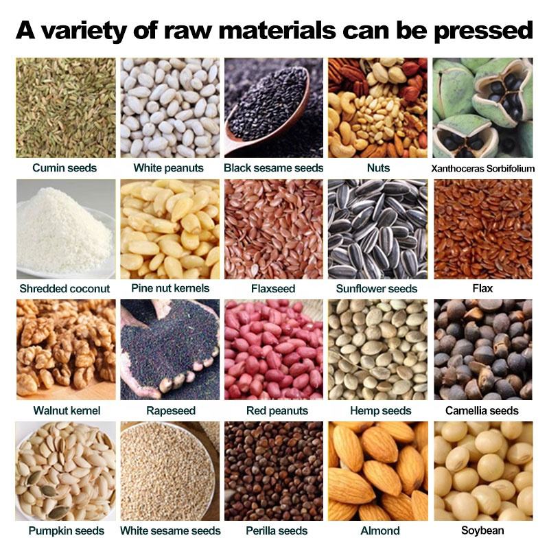 น้ำมันเมล็ดแฟลกซ์, น้ำมันเรพซีด, น้ำมันถั่วเหลือง, น้ำมันมัสตาร์ด, อะโวคาโดน้ำมัน, Rapน้ำมันเมล็ด, น้ำมันเมล็ดชา, น้ำมันจมูกข้าวโพด, น้ำมันกระเพรา, น้ำมันเมล็ดดอกคำฝอย, น้ำมันงา, น้ำมันมะพร้าวบริสุทธิ์, Pinenutน้ำมัน, น้ำมันถั่วลิสง, น้ำมันเมล็ดฝ้าย, Sunflower Seed Oil, Almond oil, น้ำมันเมล็ดฟักทอง, น้ำมันวอลนัท, น้ำมันจมูกข้าวสาลี, น้ำมันถั่วลิสง, น้ำมันมะพร้าว, น้ำมันมะกอก, น้ำมันปาล์ม, เมล็ดน้ำมันอื่นๆประเภทน้ำมัน