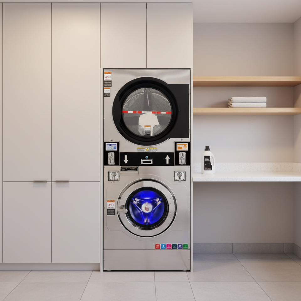 เครื่องซักผ้าอุตสาหกรรมแบบหยอดเหรียญ สแตนเลส ประสิทธิภาพสูง พร้อมเครื่องอบผ้า