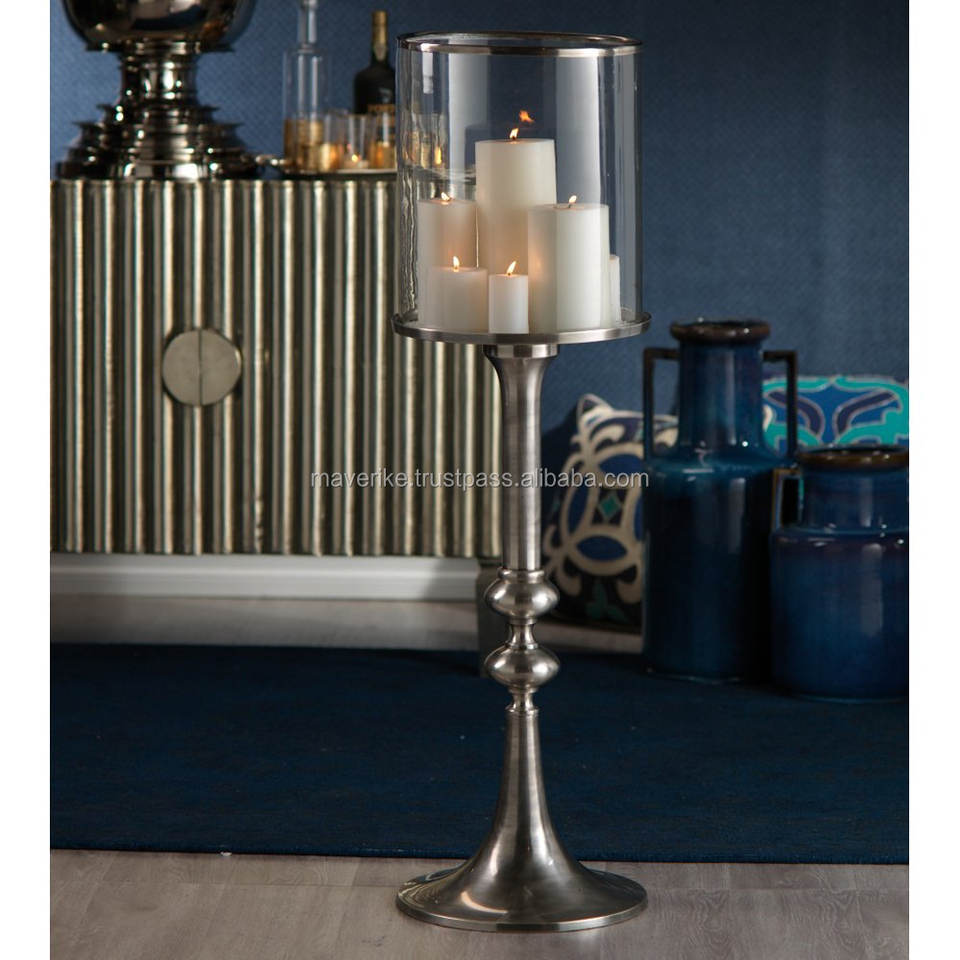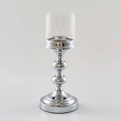 เชิงเทียนทรงเสาโลหะสีเงินอุตสาหกรรม พร้อมปล่องแก้ว ตกแต่งบ้านสไตล์เรียบง่ายสำหรับห้องนั่งเล่น ที่วางเทียนตั้งพื้น