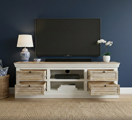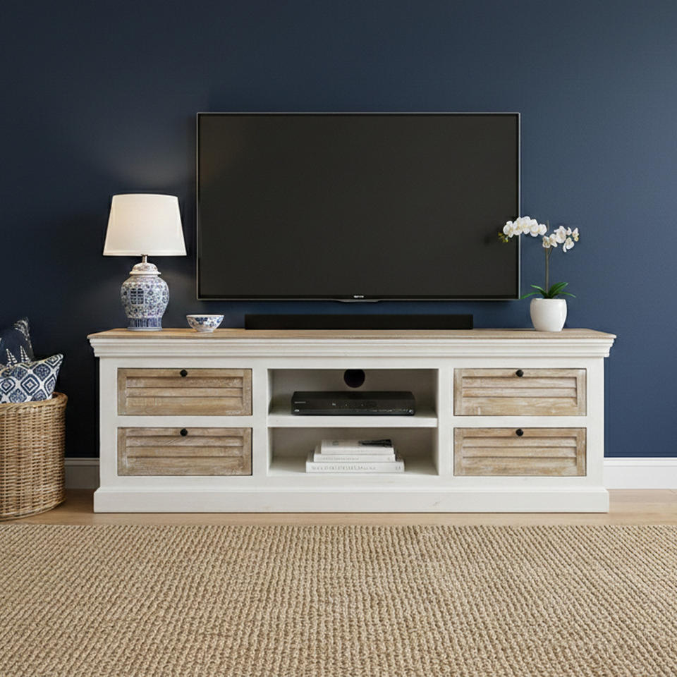 ขาตั้งทีวีไม้เนื้อแข็งปรับระดับได้ พร้อมช่องเก็บของ 4 ช่อง ดีไซน์ทันสมัย สีขาวธรรมชาติ สำหรับห้องนั่งเล่นและห้องรับประทานอาหาร