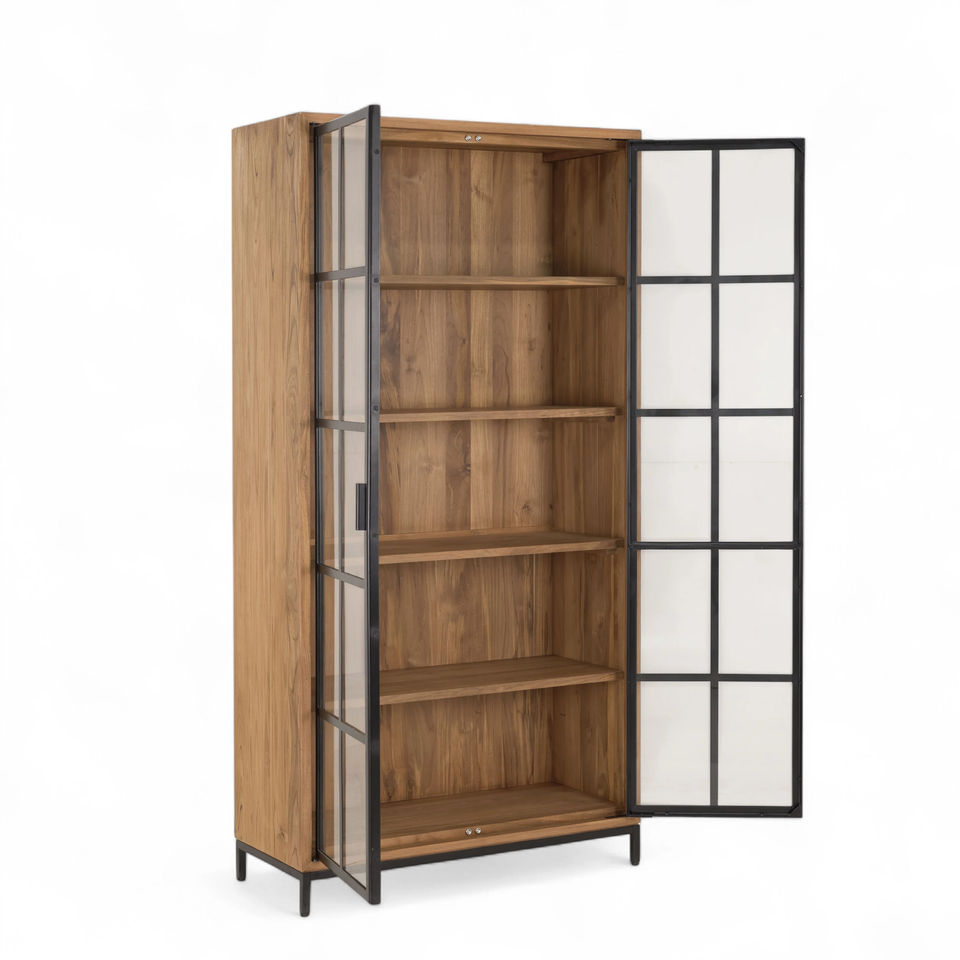 ตู้โชว์กระจก 2 บาน สไตล์อินดัสเทรียล ทำจากไม้ที่ยั่งยืน ใช้ได้หลากหลายเป็นตู้จีน ตู้บาร์ และชั้นวางหนังสือสำหรับบ้าน