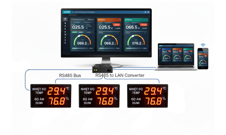 จอแสดงผล LED อุณหภูมิและความชื้นในอุตสาหกรรม ศูนย์ข้อมูล-โมดบัส RS485-ซอฟต์แวร์ SCADA ฟรี | AT-THMT-S OEM มีจำหน่ายแล้ว