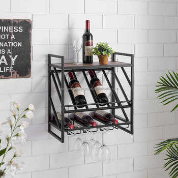 ชั้นวางไวน์โลหะสีดำติดผนังแบบอุตสาหกรรมพร้อมชั้นวางและที่วางแก้วไวน์อุปกรณ์เสริมสำหรับบาร์ที่มีสไตล์เหมาะสำหรับงานแต่งงาน