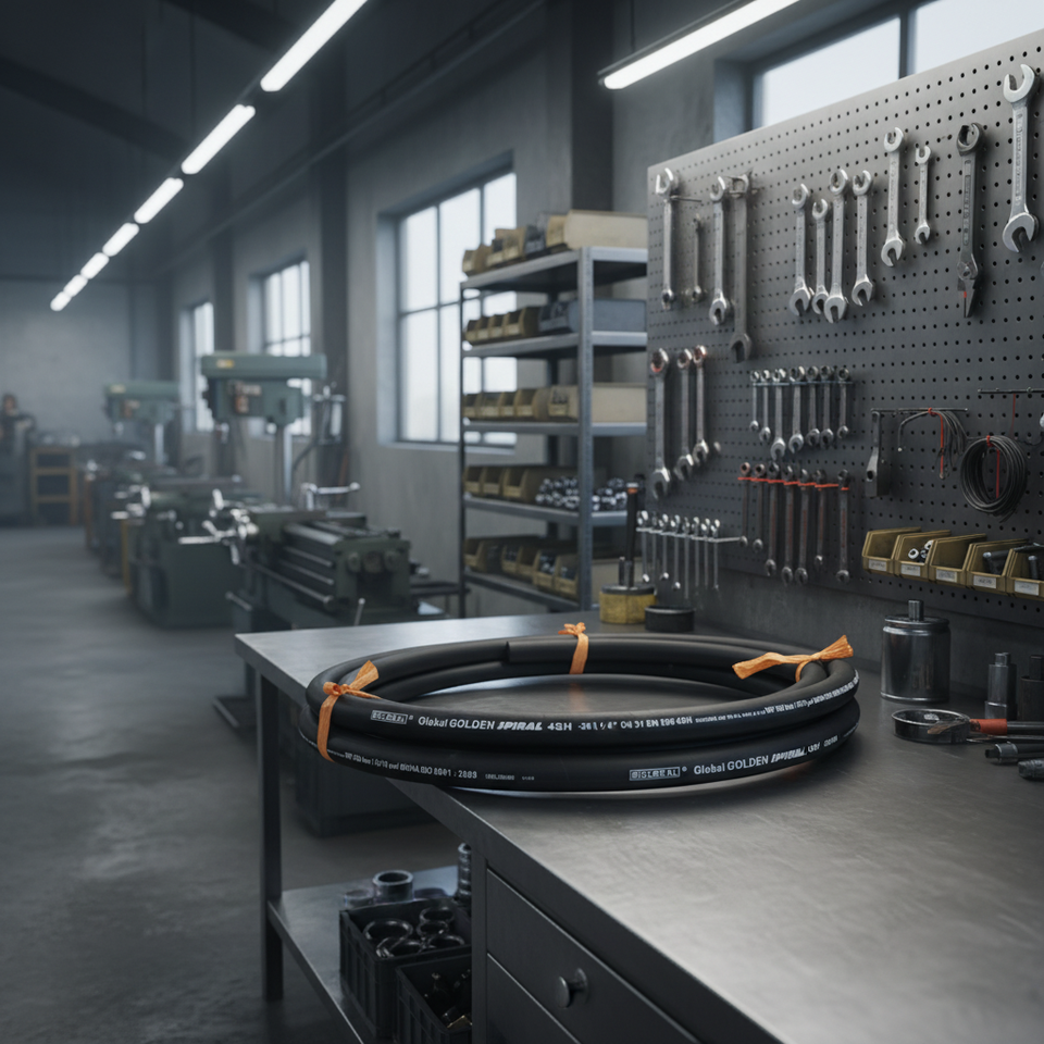 ม้วนสายไฮดรอลิกอุตสาหกรรมบนโต๊ะทำงานโลหะในโรงงานมืออาชีพ สายทนแรงดันสูงสำหรับเครื่องจักร