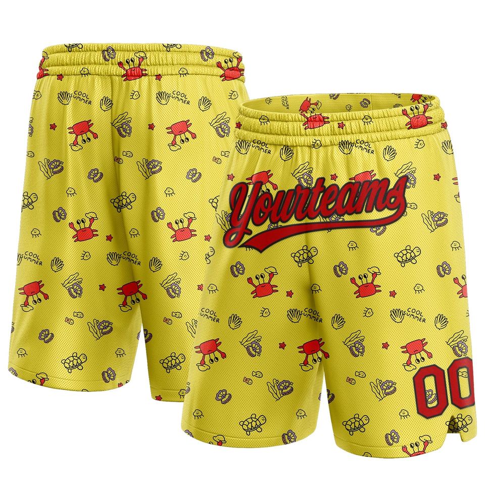 กางเกงขาสั้นบาสเก็ตบอลของแท้สำหรับเล่นกีฬาบาสเก็ตบอลสีเหลืองแดงดำ3D