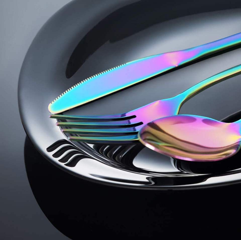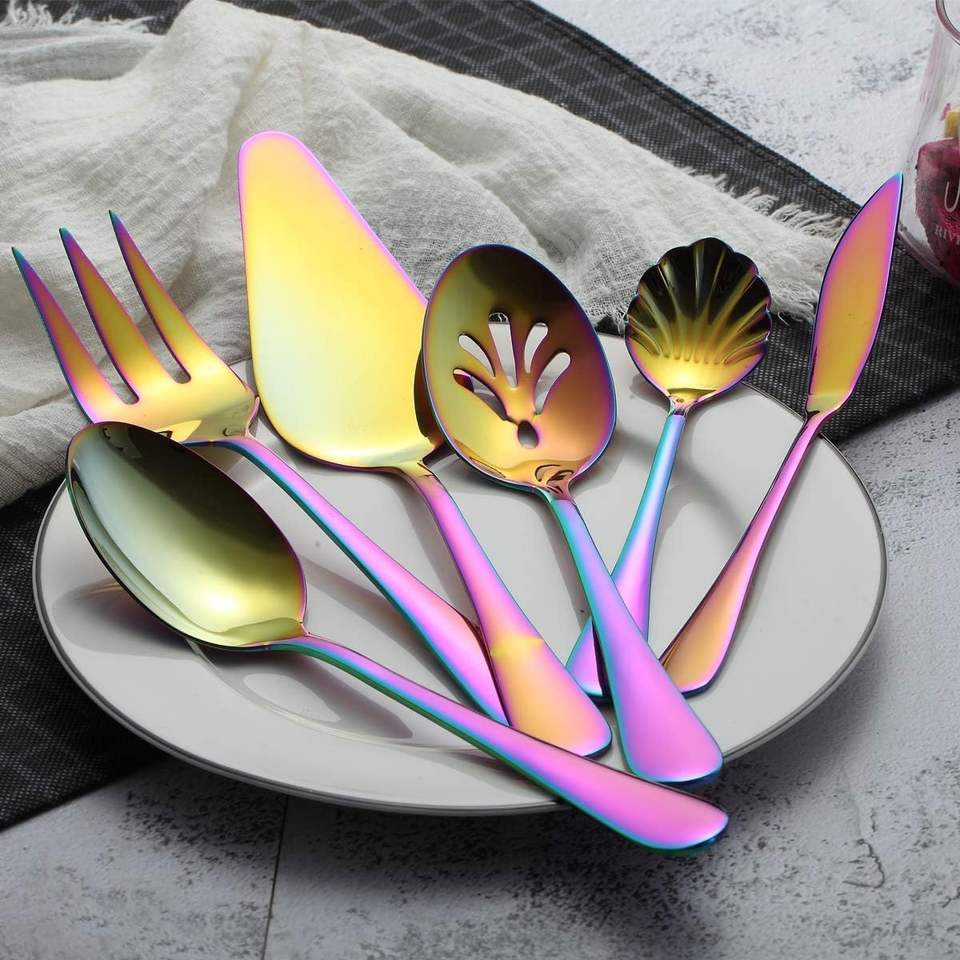 ชุดเครื่องใช้บนโต๊ะอาหารสีรุ้งแบบเคลือบเงาสำหรับโรงแรมชุดช้อนส้อมสีรุ้งสุดหรูสำหรับอุตสาหกรรม