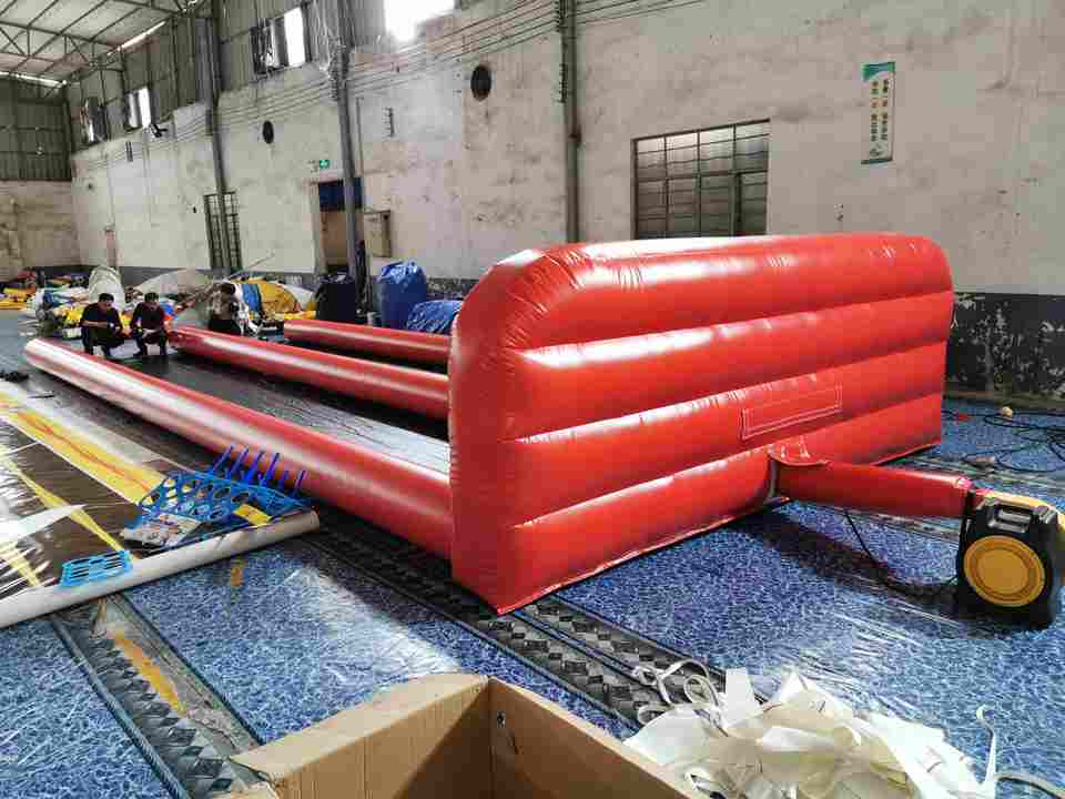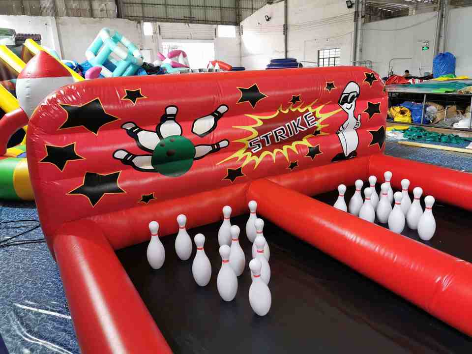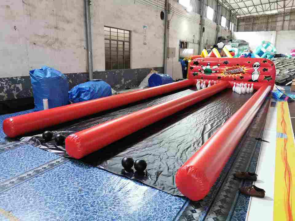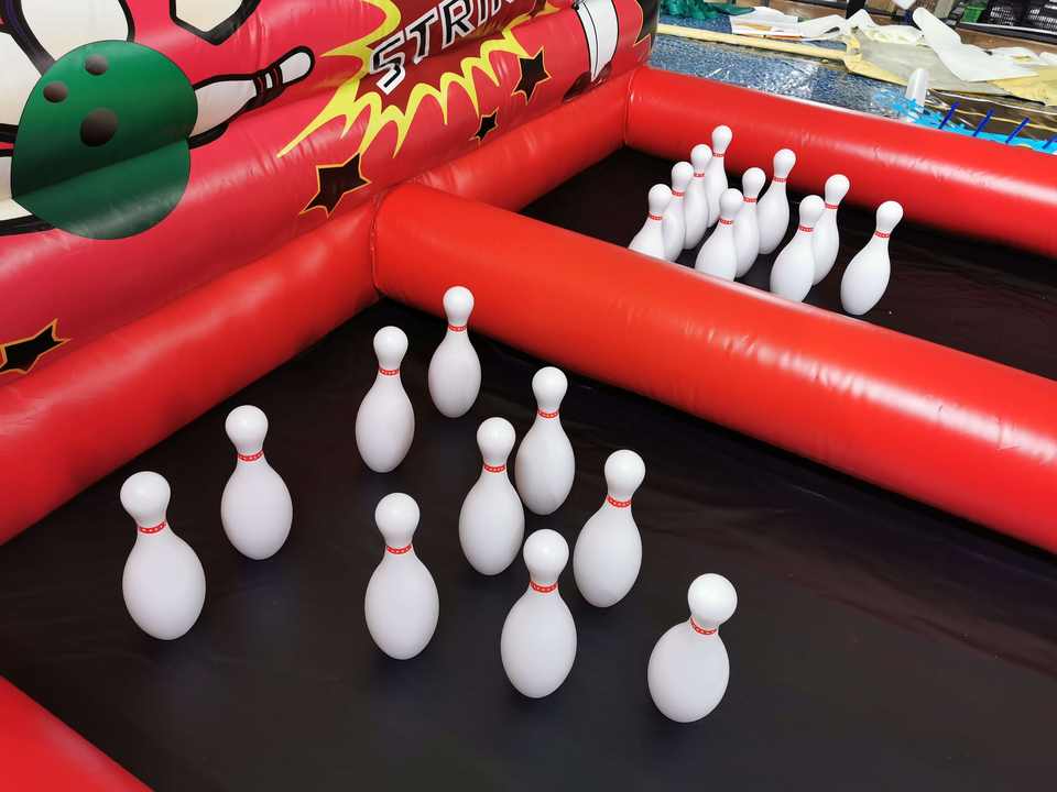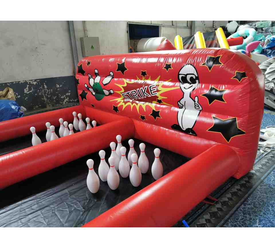 เกมโบว์ลิ่งเป่าลมแบบสองเลน วัสดุบ้านเป่าลมทำจากพีวีซี ปิดผนึกด้วยอากาศ เกมโบว์ลิ่งมนุษย์กับลูกบอล