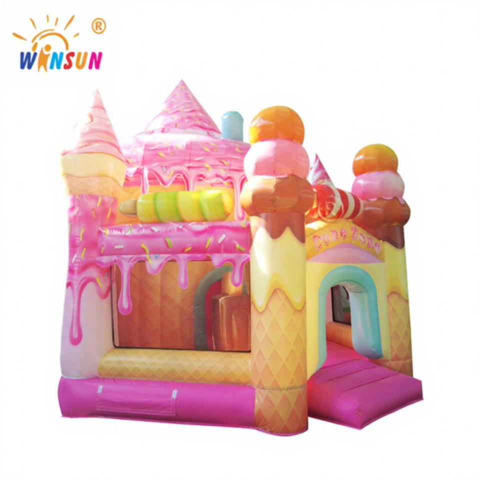 บ้านลมเป่าลมรูปไอศกรีมพร้อมแทรมโพลีนและปราสาท วัสดุ PVC ได้รับการรับรองมาตรฐาน CE ขนาดสั่งทำได้ ติดตั้งง่าย