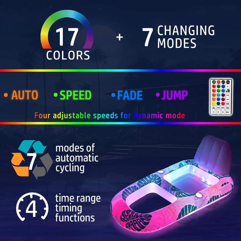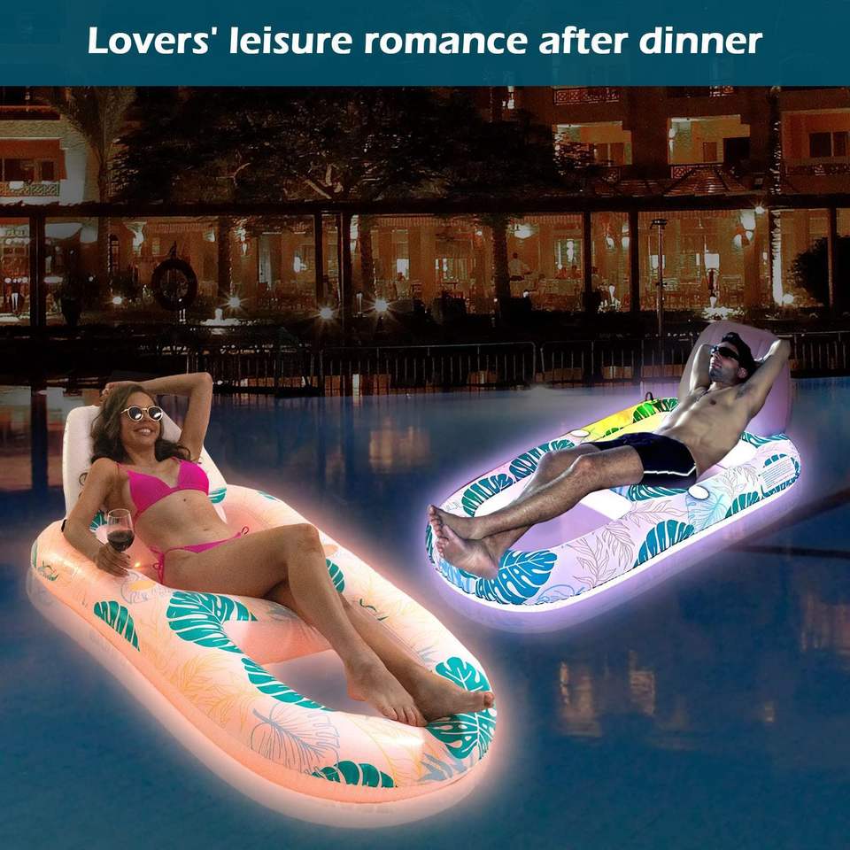 เก้าอี้ลอยน้ำเป่าลมเรืองแสงสำหรับผู้ใหญ่ พร้อมพนักพิง ระบายน้ำได้ ของเล่นในน้ำ ไฟ LED พลังงานแสงอาทิตย์ เก้าอี้พักผ่อนในสระน้ำ เตียงลอยน้ำ