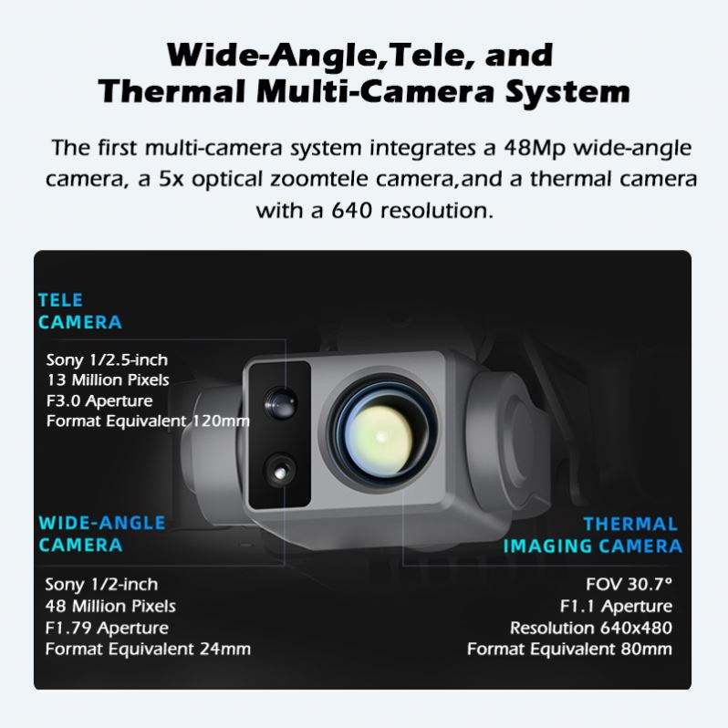 กล้องถ่ายภาพความร้อน:ความยาวโฟกัส 19 มม., ความละเอียด 640x480, ซูมดิจิตอล 8 เท่า