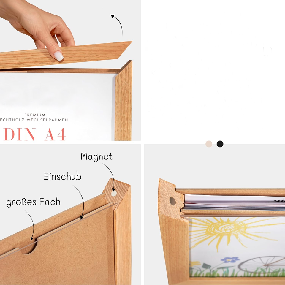 กรอบรูปไม้โอ๊คเคลือบน้ำมันอย่างชาญฉลาดสำหรับภาพวาดใน A4ของเด็กแม่เหล็กแท้แบบถอดออกได้พร้อมกรอบแก้วใส่ของขวัญ