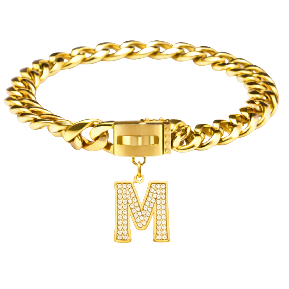 จี้ตัวอักษร M สีทองสำหรับปลอกคอสุนัข ของตกแต่งสัตว์เลี้ยงสุดหรู ดีไซน์เก๋ไก๋