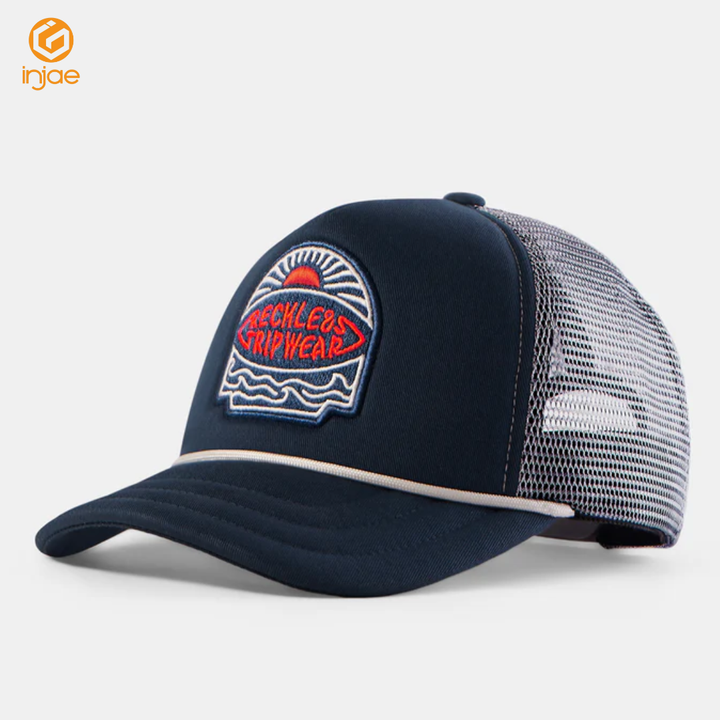 หมวกแก๊ปทรงทรัคเกอร์ 5 แผง คุณภาพสูง โครงสร้างโฟม ตาข่าย โค้งเล็กน้อย ปักโลโก้แบบสั่งทำ สายรัดแบบสแนปแบ็ค สำหรับเล่นกีฬาวิ่ง