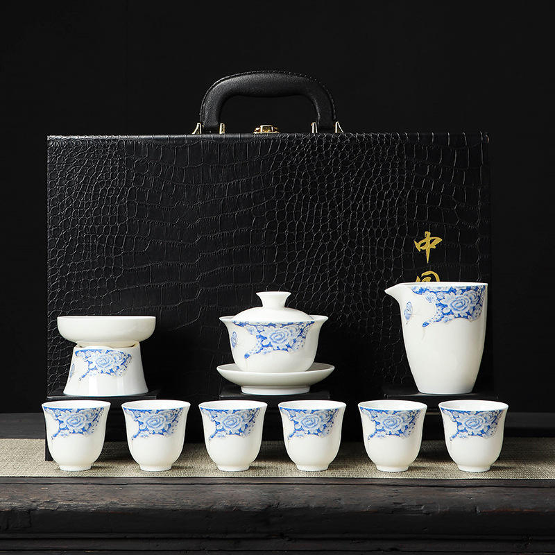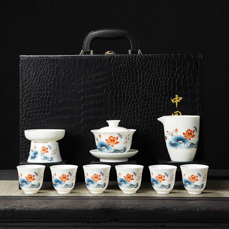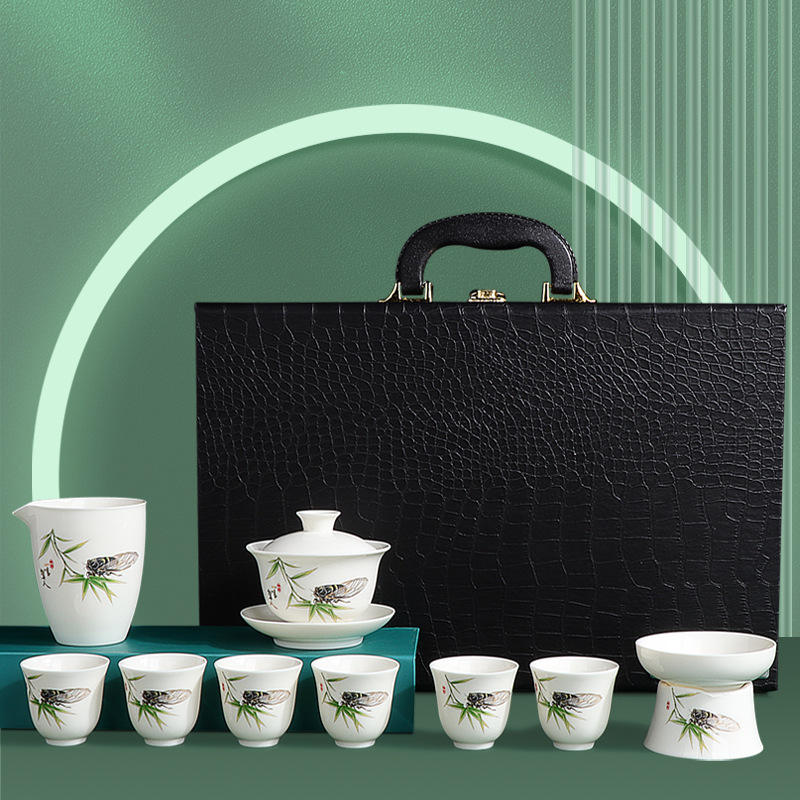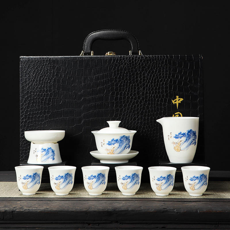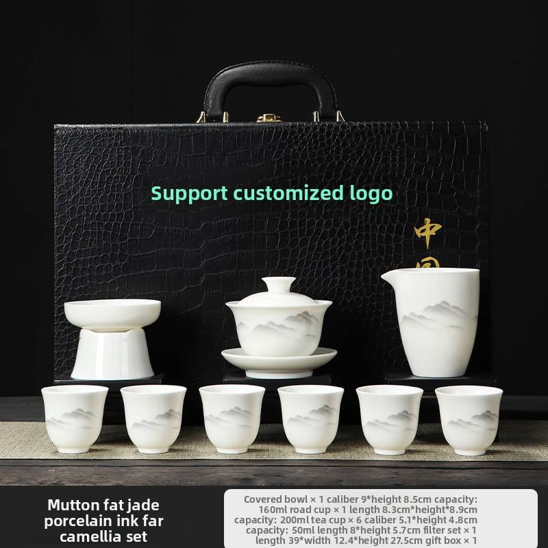 Ink and Wash Distant Mountain Mutton-fat Jade Tea Set, Kung Fu Tea Set, Household Three Talents Cover Bowl Set Business Gift