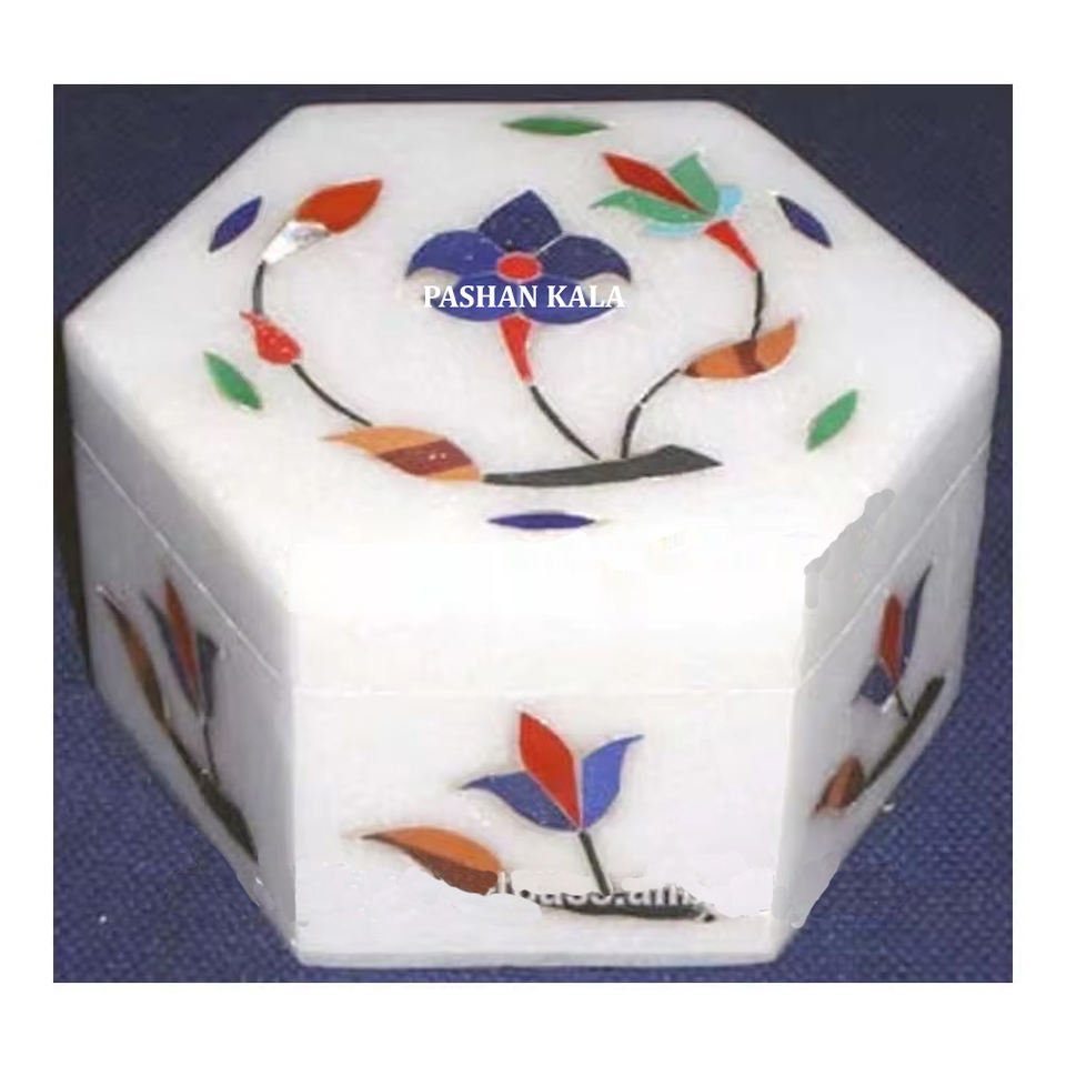 กล่องของขวัญฝังหกเหลี่ยมสำหรับตกแต่งบ้านและงานแต่งงานหินอ่อนสีขาวที่สวยที่สุดพร้อมศิลปะลายดอกไม้หลากสี