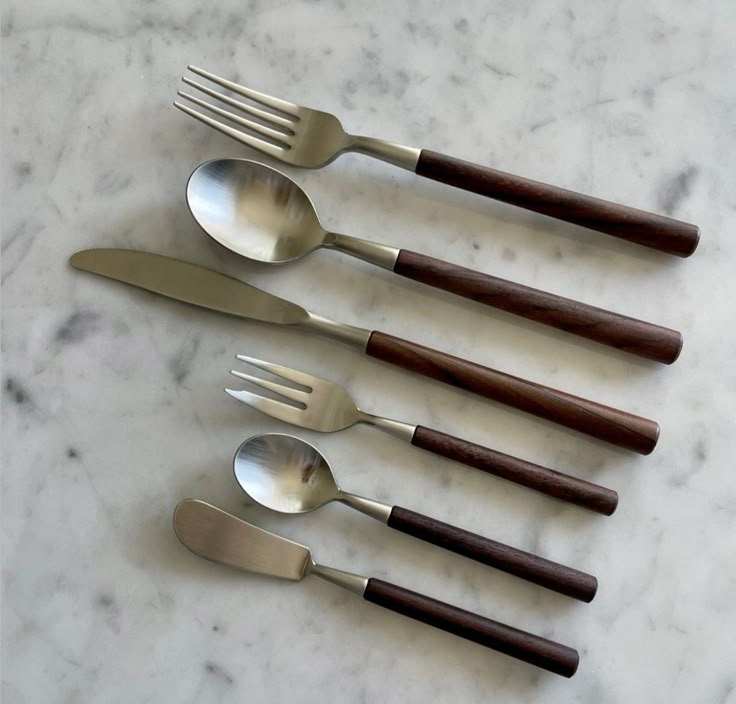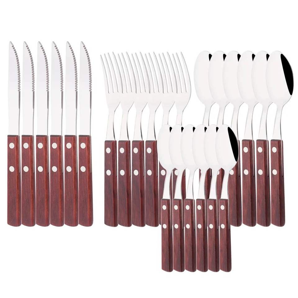 ชุดเครื่องใช้บนโต๊ะอาหารทำจากสแตนเลสพร้อมที่จับไม้สำหรับบรรยากาศการรับประทานอาหารที่ทันสมัย