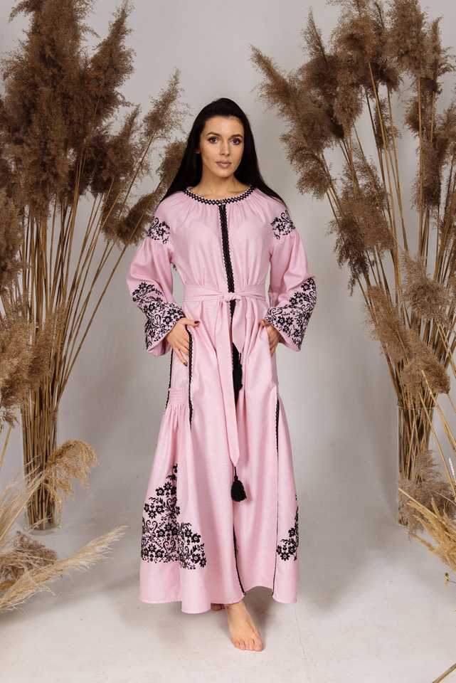 ชุดเดรสยาวปักลายยูเครนนวัตกรรมชุดเดรสแนวรีสอร์ตแนวลำลองสีชมพูแขนสั้นและรอบเอวธรรมชาติสำหรับการพักผ่อนในฤดูร้อน