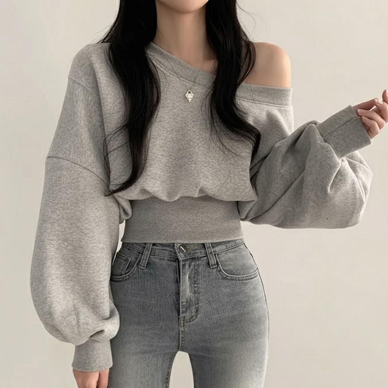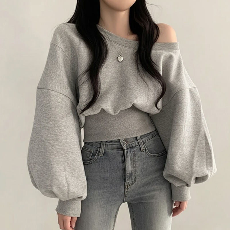 เสื้อสเวตเชิ้ตสีพื้นเรียบง่ายแบบเปิดไหล่ แขนทรงระฆัง ช่วงเอวเข้ารูป สไตล์ลำลอง ใส่ได้หลายโอกาสสำหรับผู้หญิง