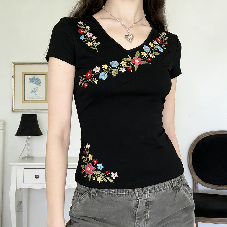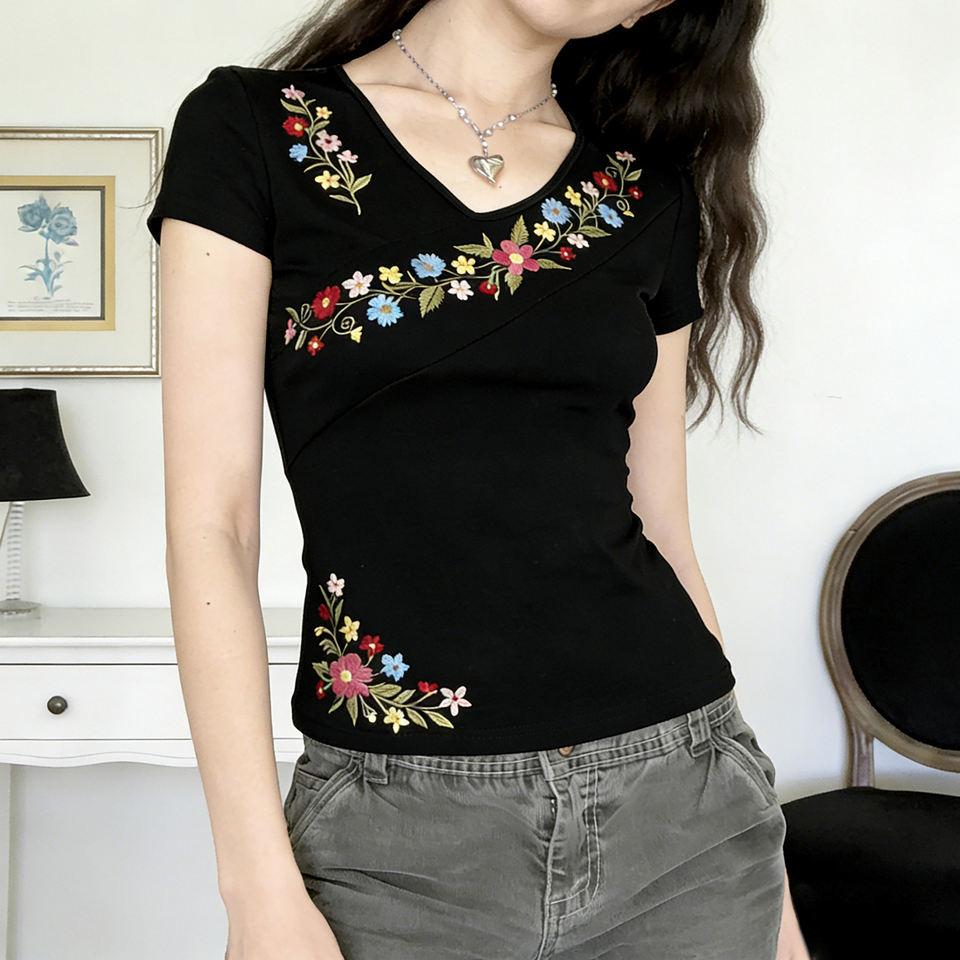 เสื้อยืดคอวีปักลายดอกไม้สไตล์เรโทรสำหรับผู้หญิง ทรงเข้ารูป คอเสื้อไม่สมมาตร แขนสั้น ใช้งานได้หลากหลาย สวมใส่สบาย