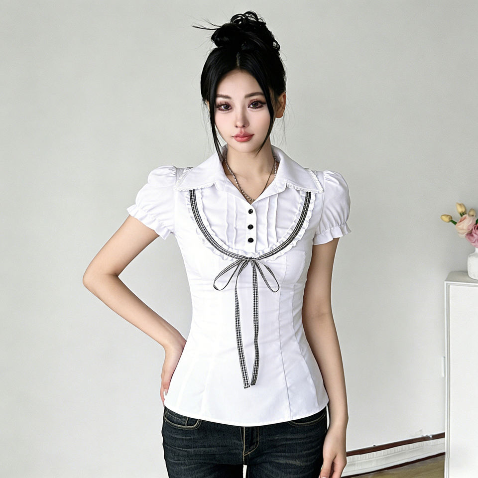 เสื้อเบลาส์แขนสั้นทรงเข้ารูป แต่งระบาย คอปกประดับริบบิ้นสีขาวดำ ติดกระดุม แต่งลูกไม้ แขนพอง สไตล์หวานๆ แบบนักศึกษา สำหรับฤดูร้อน
