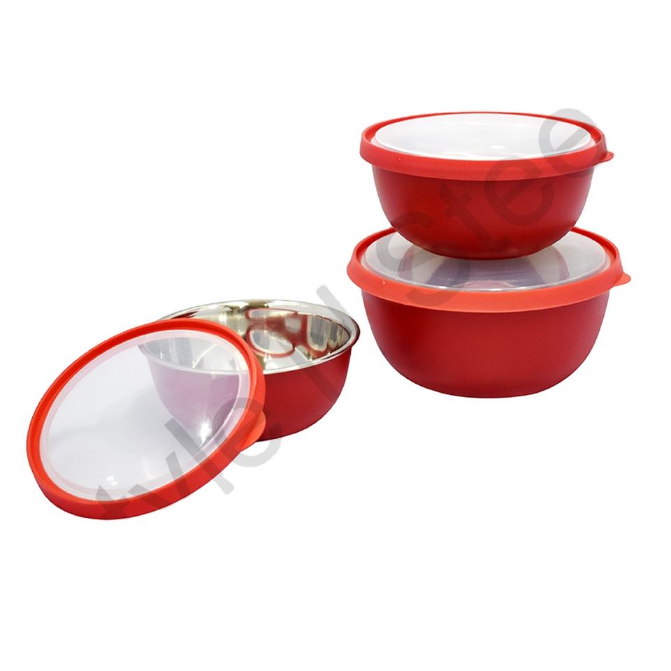 ภายในโปแลนด์นอกสีแดงแมตต์สีพลาสติกสแตนเลสไมโครเวฟชามปลอดภัยที่มีซีทรูฝา3ชิ้นชุด