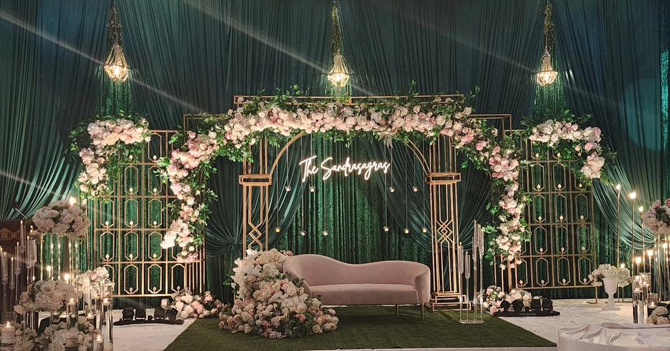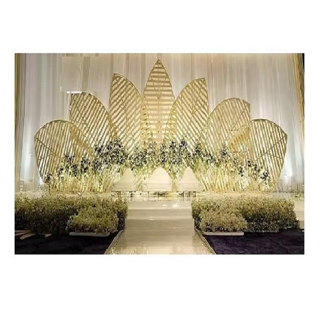 แรงบันดาลใจในการตกแต่งในร่มพร้อมฉากหลังโลหะสำหรับเวทีแต่งงานที่หรูหราในร่มฉากหลังโลหะสำหรับเวทีเจ้าสาวพร้อมกรอบโลหะ