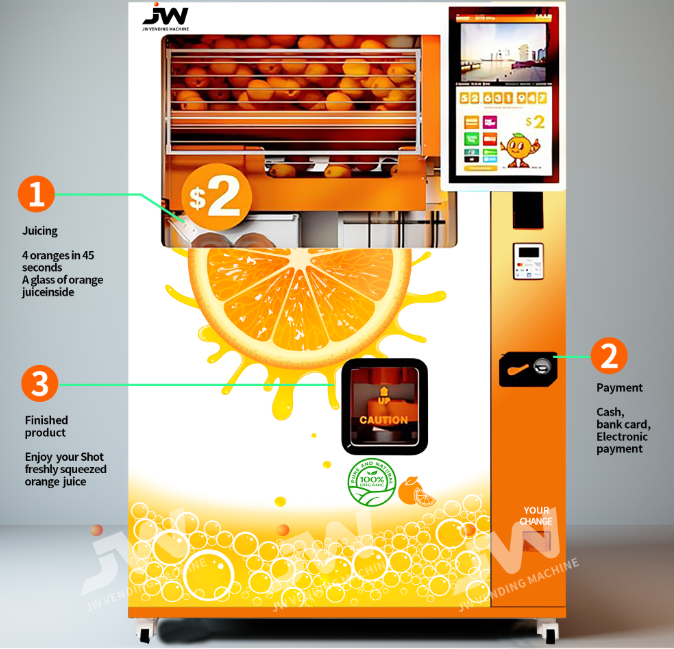 เครื่องจำหน่ายน้ำส้มอัตโนมัติเต็มรูปแบบ24ชั่วโมงอัจฉริยะโดยไม่มีคนน้ำผลไม้เชิงพาณิชย์