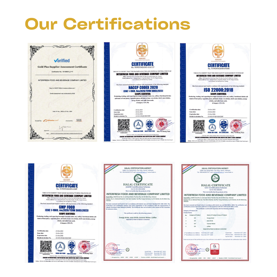 การรับรอง:ฮาลาล, ISO 22000:2018, GMP และ HACCP