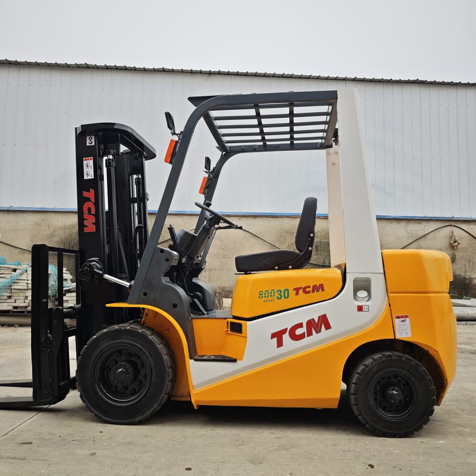 รถยกดีเซล TCM มือสอง ขนาด 3 ตัน แบบนั่งขับ ระบบสูบจ่ายเชื้อเพลิงภายใน พร้อมเสากระโดงสองท่อน ระบบไฮดรอลิก ไซด์ชิฟเตอร์ และล้อตัน