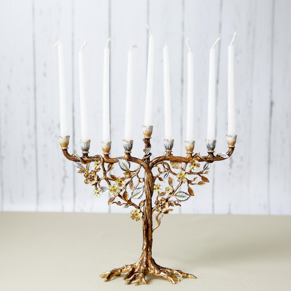 "Intricate blooming tree menorah in antique gold finish with delicate leaves and flowers, a stunning piece, at wholesale price."