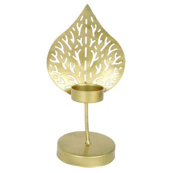 ลวดลายฉลุที่ประณีตในเชิงเทียนโลหะสร้างเอฟเฟกต์เงาอันน่าหลงใหลบนผนังรอบๆ