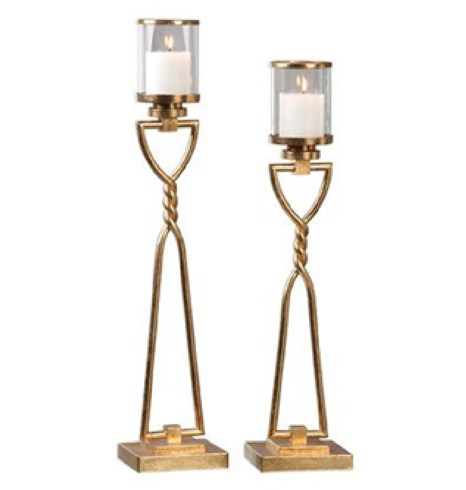เชิงเทียนรูปกิ่งไม้ทองเหลืองประดับด้วยคริสตัลรูปใบไม้และถ้วยแก้ว มีจำหน่ายในราคาขายส่ง