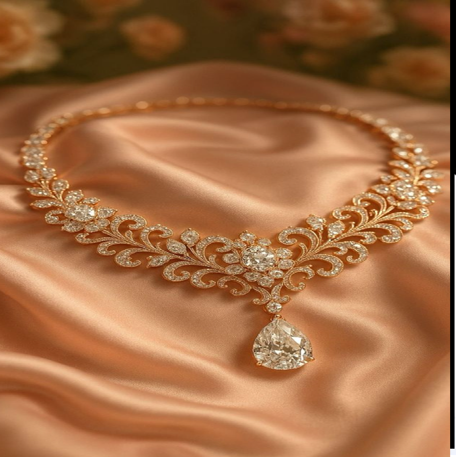 สร้อยคอทองคำลายฉลุประณีตพร้อมจี้คริสตัลทรงหยดน้ำขนาดใหญ่ มีจำหน่ายในราคาขายส่ง