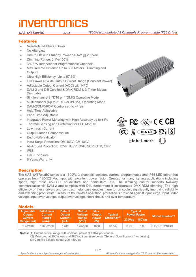 หรี่ไป-ปิดด้วยพลังงานสแตนด์บาย:≤ 0.5W @ 230Vac
