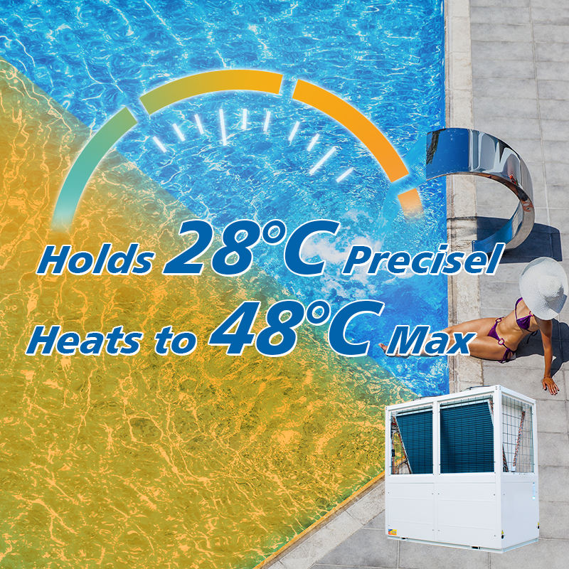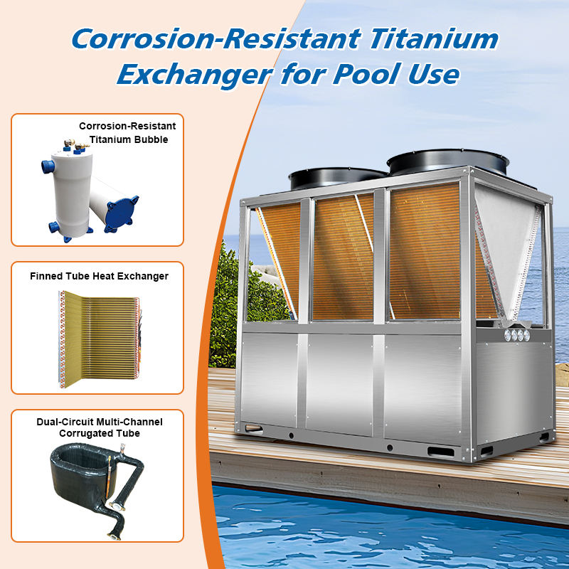 เครื่องทำความร้อนแบบอินเวอร์เตอร์สำหรับสระว่ายน้ำและสปา ตัวเครื่องสแตนเลส ใช้สารทำความเย็น R410A สำหรับใช้งานภายนอกอาคาร เหมาะสำหรับโรงแรม