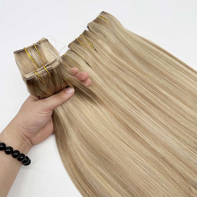 ผมต่อแบบรัศมียาว24นิ้ว60ซม. สีบลอนด์น้ำตาลเข้มแบบมองไม่เห็น150กรัมติดฉลากส่วนตัว