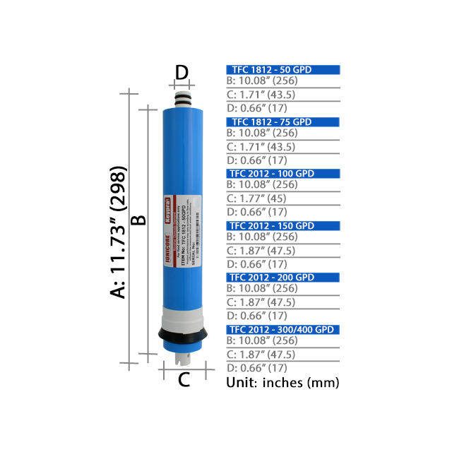 Thin Film Composite (TFC) Membrane, Spiral Wound RO Membrane Design, High Salt Rejection up to 98%, Polyamide Multilayer Membrane Structure, Standard 1812 / 2012 RO Housing Compatibility, Residential Drinking Water RO Systems, Wide Flow Range 50-400 GPD, High Contaminant Rejection Performance, Long Service Life up to 24 Months