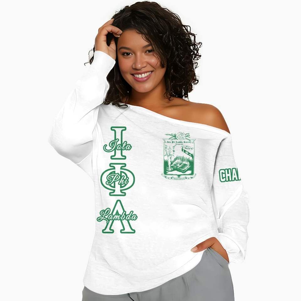 Iota phi Lambda สเวตเชิ้ตเปิดไหล่ตามสั่งสีขาวมรกตสีเขียวไอโอตาฟีแลมด้าเสื้อสโมสร