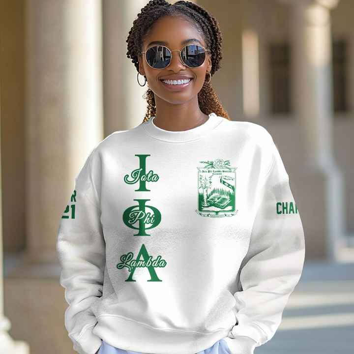 เสื้อแจ็คเก็ตวาร์ซิตี้แบบกำหนดเองของชมรมไอโอต้า ฟี แลมบ์ดา เสื้อแจ็คเก็ตวาร์ซิตี้สีขาวแบบสั่งทำพิเศษ เสื้อสเวตเชิ้ตสมาคมไอโอต้า ฟี แลมบ์ดา