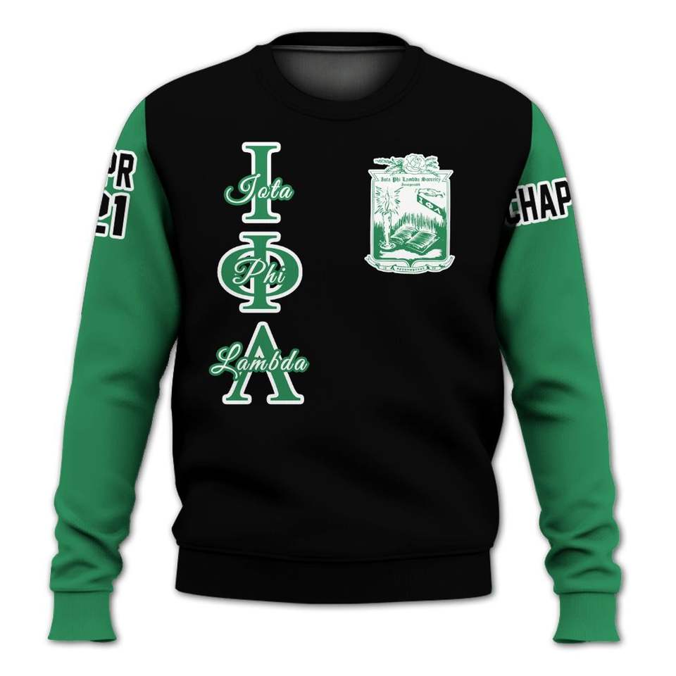 เสื้อสเวตเชิ้ต Iota Phi Lambda Custom Chapter สีดำ สีเขียวมรกต สมาคมนักศึกษากรีกตระกูลหญิงต่างชาติ ตั้งแต่ปี 1929 เสื้อพิมพ์ลายตราสัญลักษณ์แบบส่วนตัว