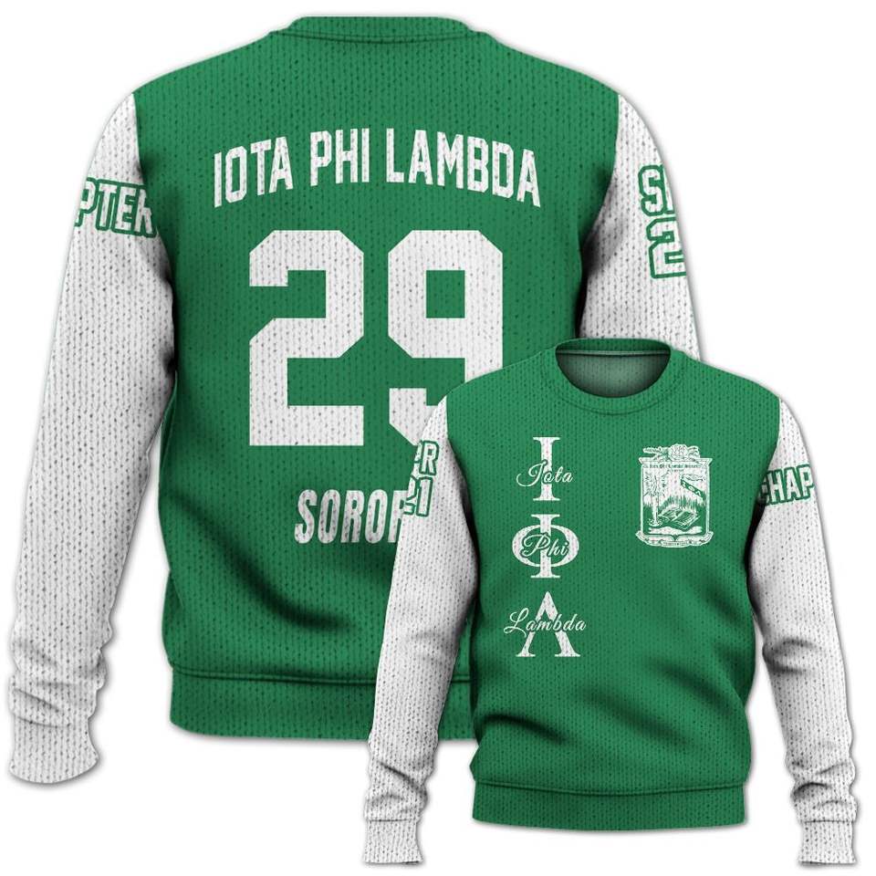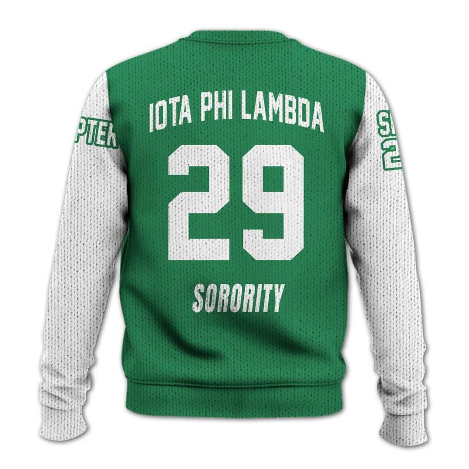 เสื้อแจ็คเก็ตวาร์ซิตี้สีเขียวมรกตแบบกำหนดเองของ Iota Phi Lambda พร้อมเสื้อสเวตเตอร์ถักของชมรม Iota Phi Lambda