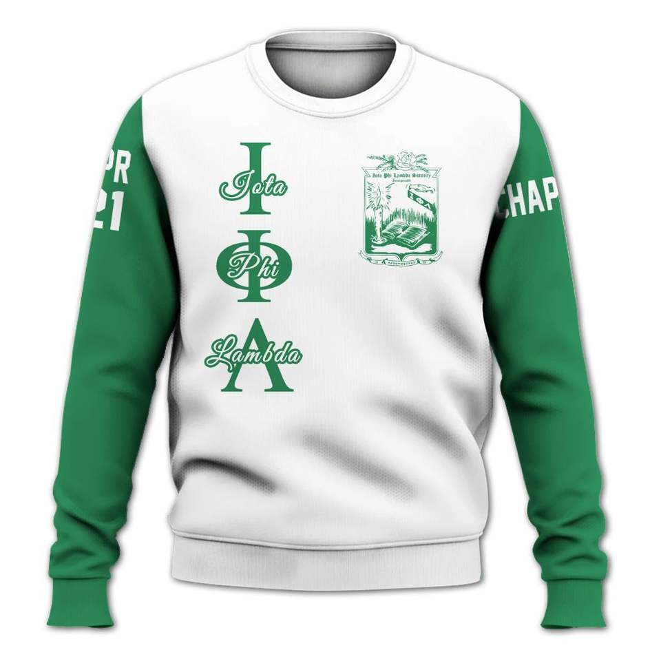 Iota phi Lambda แจ็คเก็ตทีมตัวแทนที่กำหนดเองสีขาวผสมสีเขียวมรกตเสื้อสเวตเชิ้ตชมรม Iota Phi Lambda sorority
