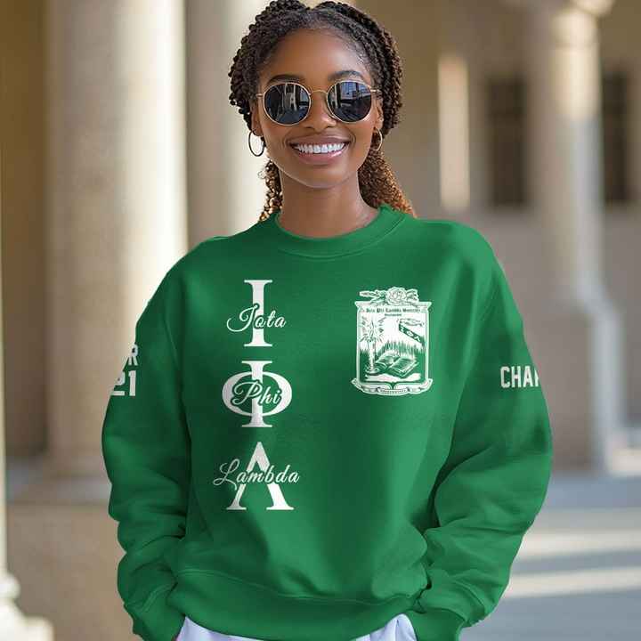 เสื้อสเวตเชิ้ตแบบกำหนดเองของ Iota Phi Lambda สีเขียวมรกต ขาว ลายตราสัญลักษณ์ตัวอักษรกรีก สำหรับสตรี ตั้งแต่ปี 1929