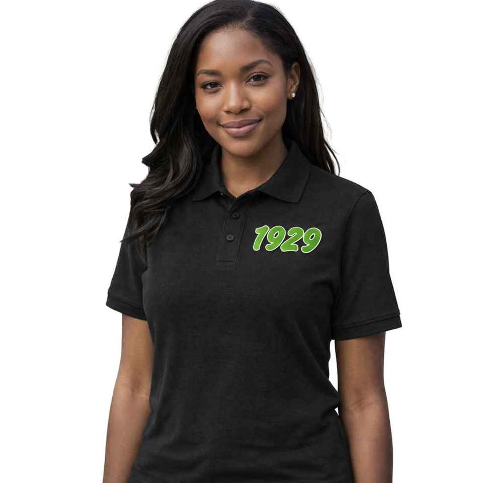 เสื้อโปโลสีดำ Iota Phi Lambda Sorority พร้อมตัวอักษรกรีก ปีก่อตั้ง 1929 เสื้อคอปกแขนสั้นลำลองสำหรับผู้หญิง