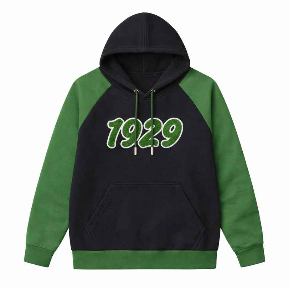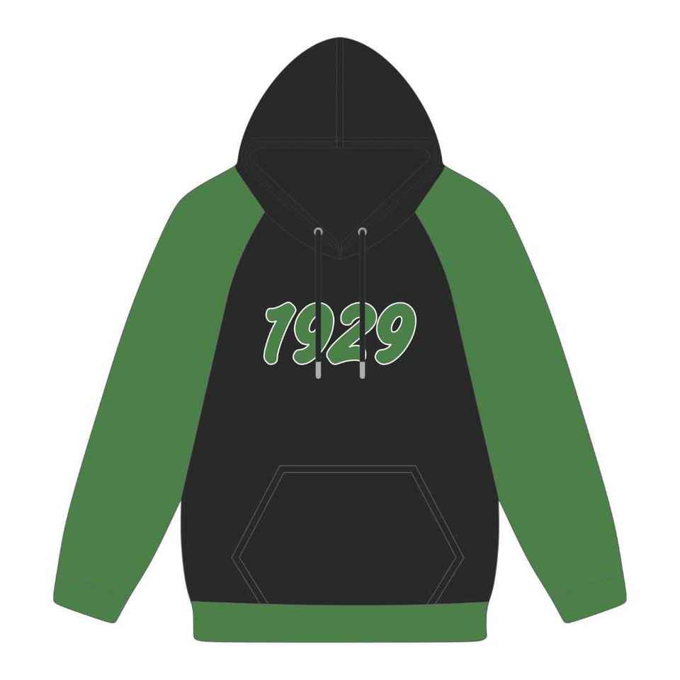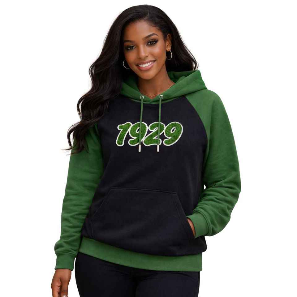 เสื้อฮู้ดแขนยาวสีดำ Iota Phi Lambda Sorority ปีก่อตั้ง 1929 แขนเสื้อสีเขียวมรกต ตัวอักษรกรีก เสื้อผ้าสำหรับผู้หญิง