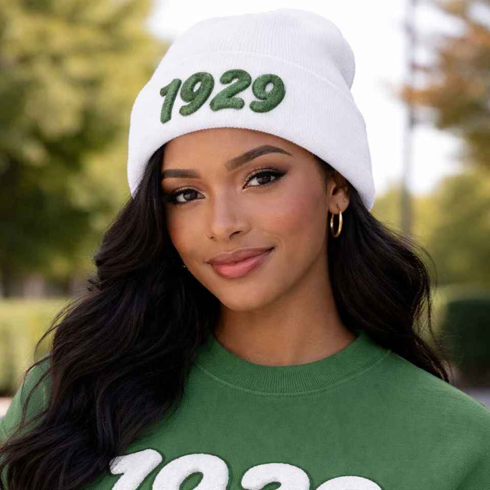 หมวกไหมพรมสีขาว Iota Phi Lambda Sorority พร้อมตัวอักษรกรีก ปีก่อตั้ง 1929 หมวกไหมพรมสำหรับผู้หญิงสำหรับฤดูหนาว อุปกรณ์สวมศีรษะให้อบอุ่น