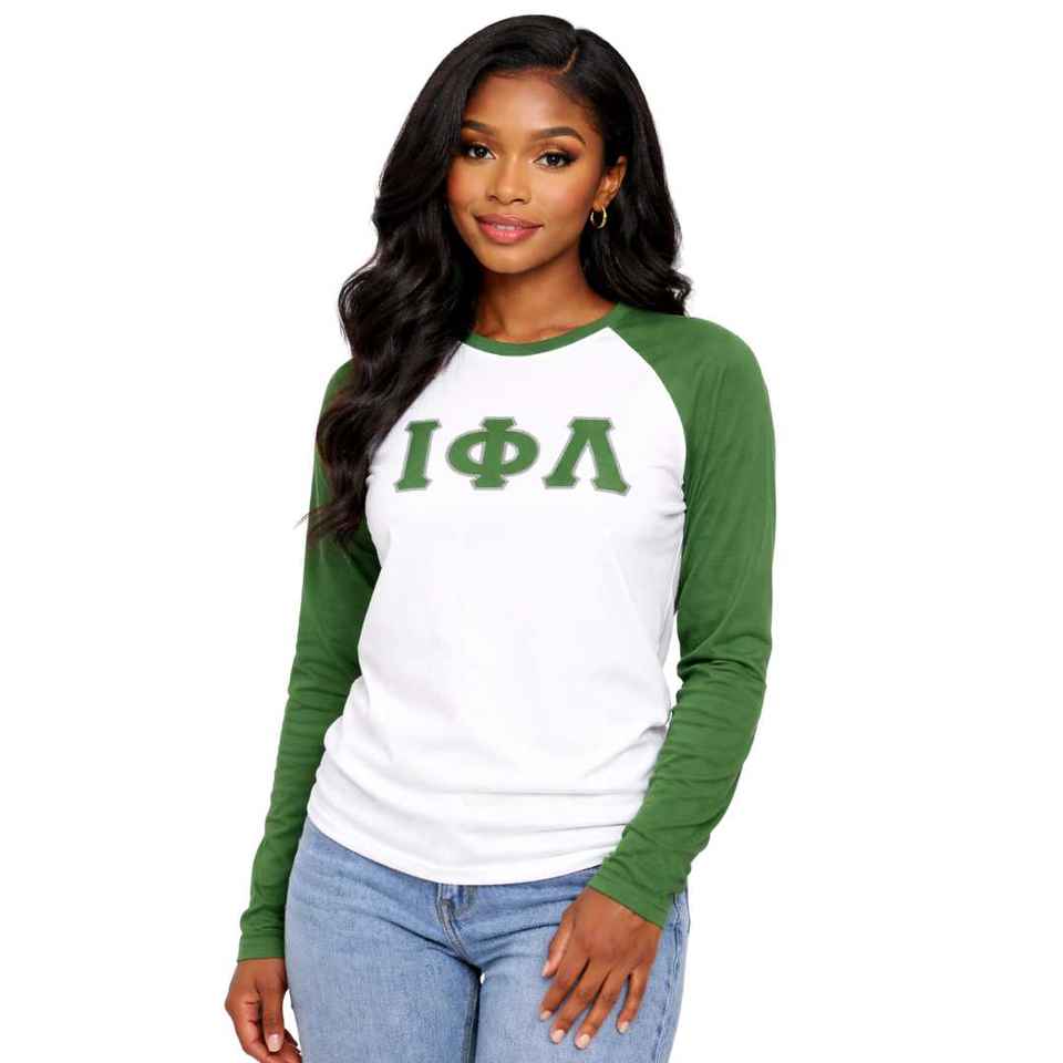 เสื้อแขนยาวสีขาวของชมรมอิโอต้า ฟิ แลมบ์ดา แขนเสื้อสีเขียวมรกต ตัวอักษรกรีก เสื้อผ้าลำลองสำหรับผู้หญิง ระดับพรีเมียม