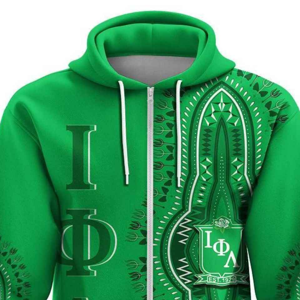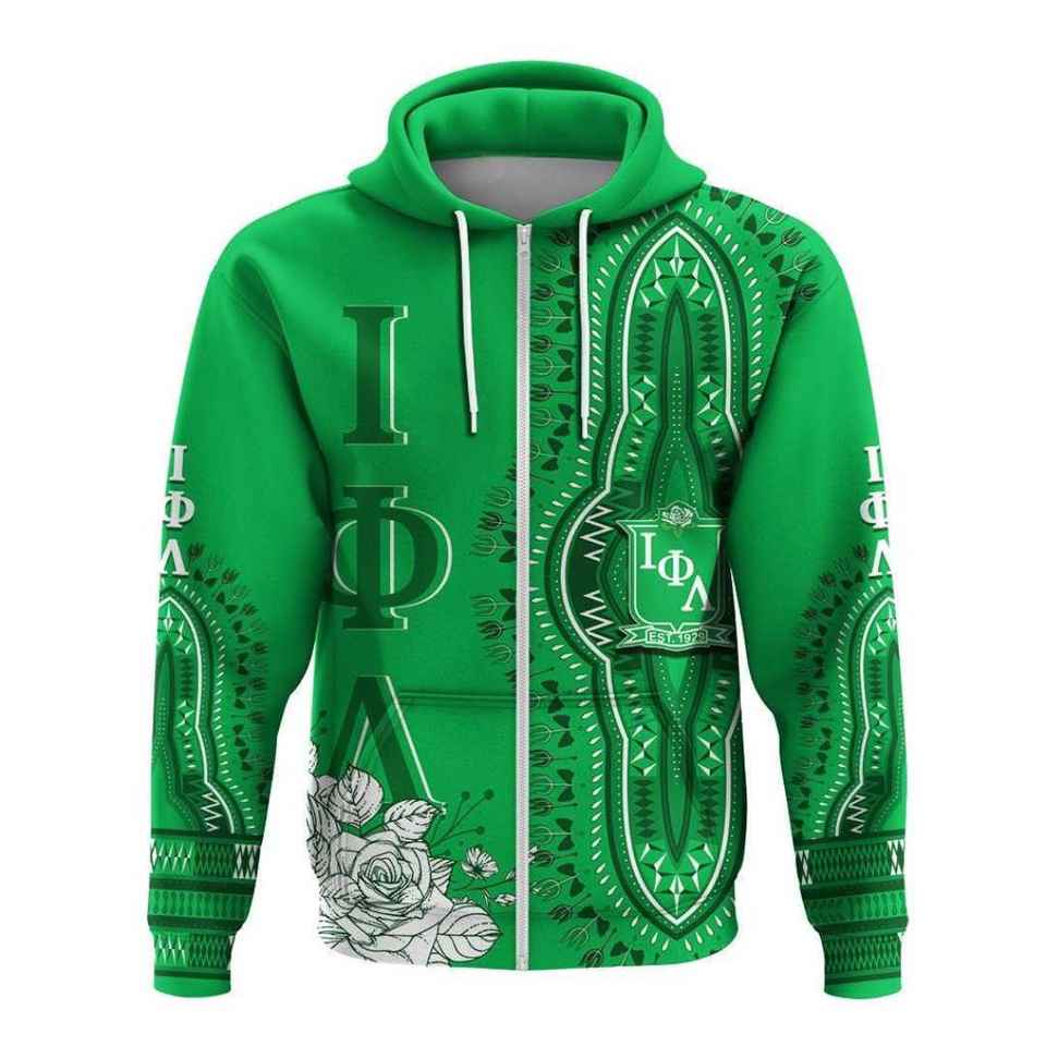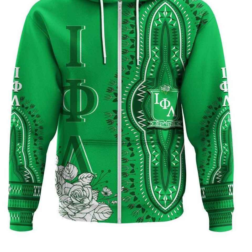 เสื้อฮู้ดซิป Iota Phi Lambda Sorority สีเขียวมรกต ลายดอกกุหลาบแบบดาชิกิ เสื้อสเวตเชิร์ตซิปเต็มตัวแบบสั่งทำได้ สำหรับทุกเพศ เสื้อฮู้ดสไตล์แอฟริกัน